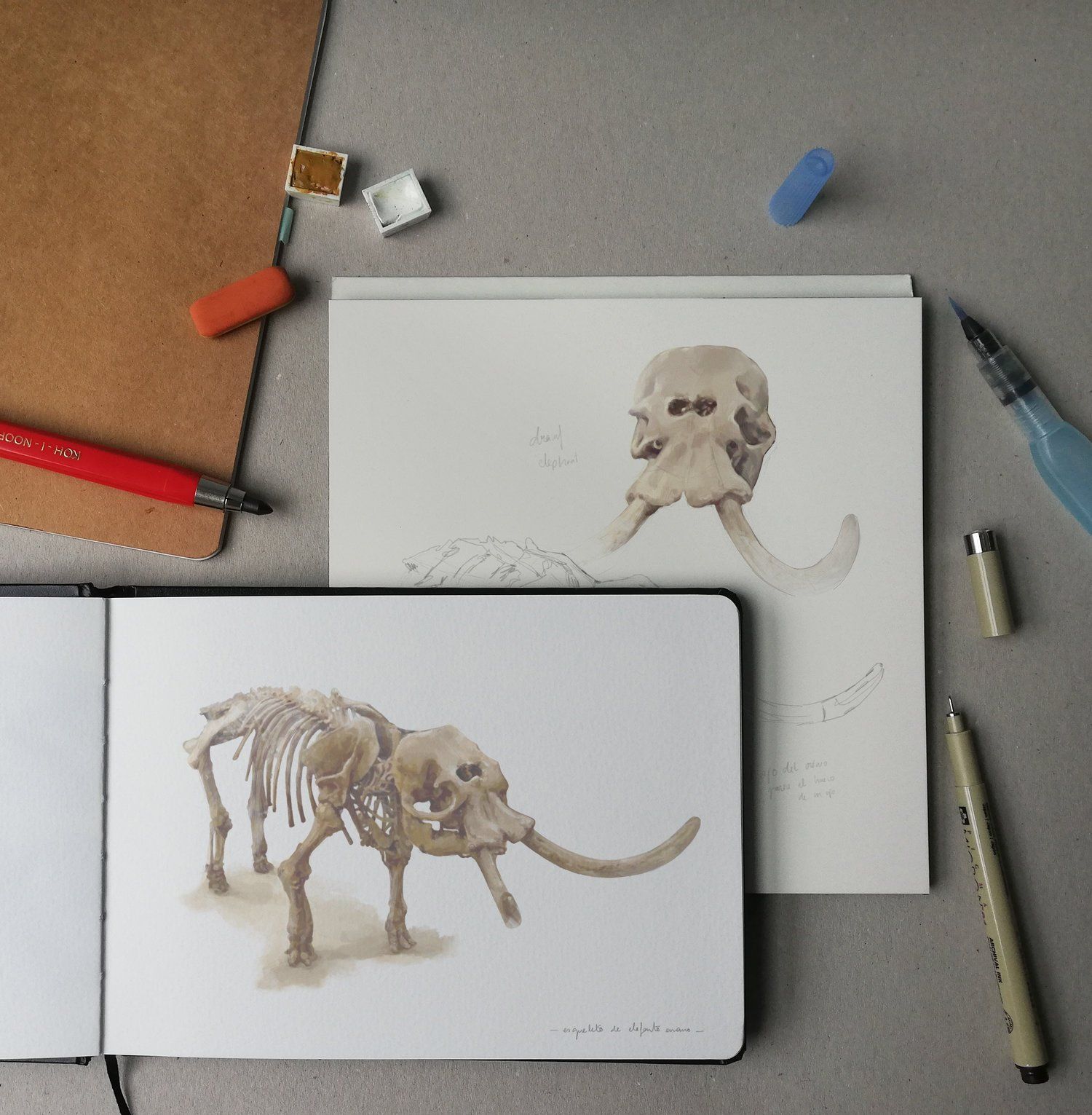 I currently work with watercolors, acrylic, clay, paper and, plaster, using a combination of brushes and hand-made tools.